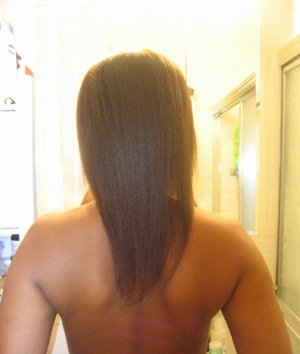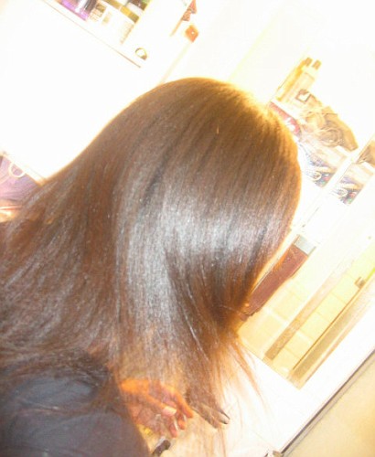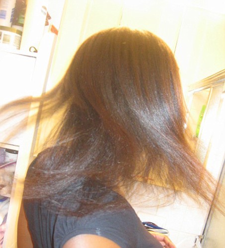 Then I had a Damage Remedy Treatment that included mixing two bottles of thin, cream treatment called “moisture infusion” and “strength infusion.” They were put on the length of my hair with an applicator brush. The comb out was the next problem. The student, who had been trained for 8 months, tried to comb out my 34 week post hair from the root. I took the comb from her and showed her how to comb out my hair from the ends up to the root. She still tried the root comb out and I showed her several more times how to comb out my hair. She did get it after a while.