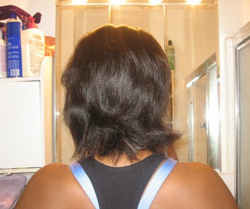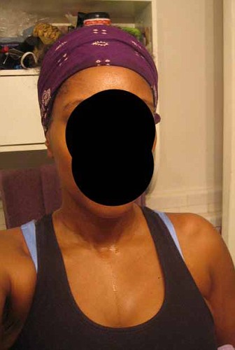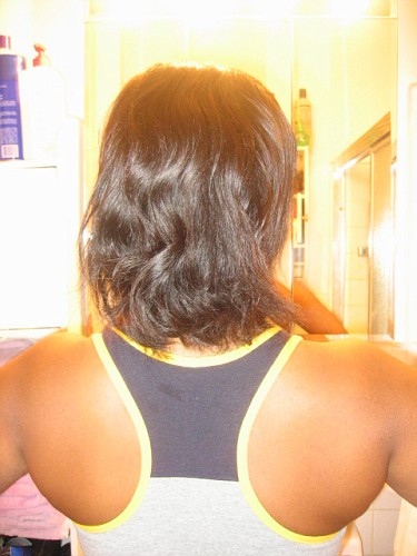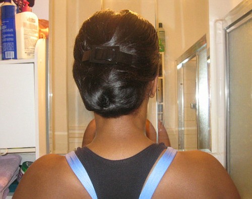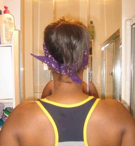 When I decided to transition to natural, roller setting was not always an option with the different hair textures.  Instead, I decided to use a scarf method.  I tied a bandanna around my edges to keep them smooth and I put my hair into a high ponytail.  That worked well for me since I am not one to sweat from my scalp.  However, if you do sweat from your scalp, you probably do not want to tied down you hair to force your hair to touch your sweaty scalp.  Only tie down your edges.  I find that a high ponytail works best during a workout while still holding on to relaxed hair.  Pin curls can also be your friend.  Although you may not feel comfortable working out in a gym setting with pin curls, it works well for me when I am at home working out.