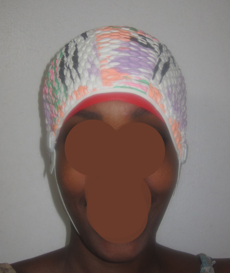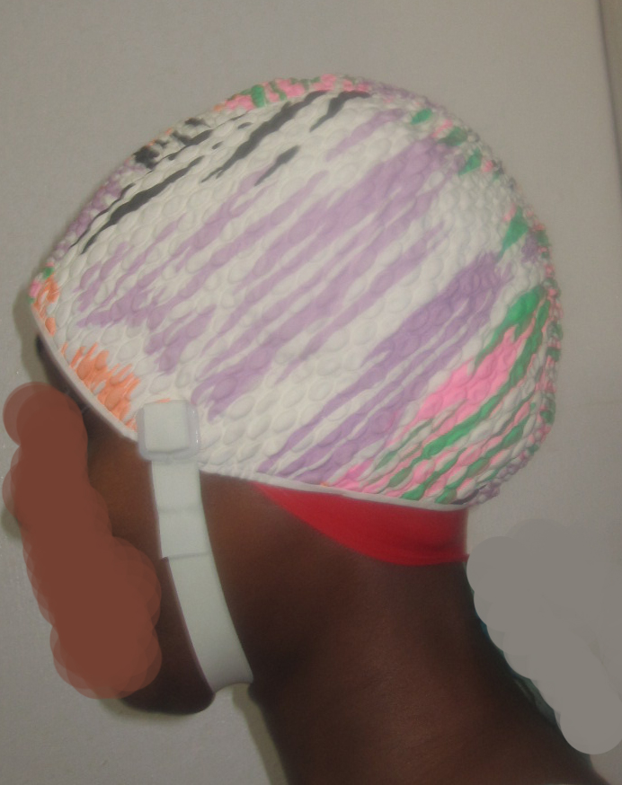 If you find that the latex cap is too small, you can cut a hole across the top and use it as a headband, pulled down to your ears with your hair sticking out of the top.  You do not want any gaps in the seal against your skin.  Please be aware that cutting the cap will make it more prone to ripping.  The swim cap in the photos is a red latex cap since my purple silicon cap ripped apart after a few uses.  That purple silicon cap was cut across the top and used as a swim headband to make sure there were no gaps.  I may purchase another silicon cap and I will be more careful when applying and removing it.