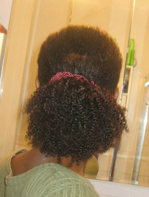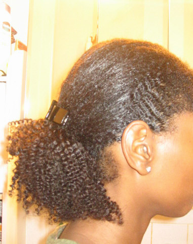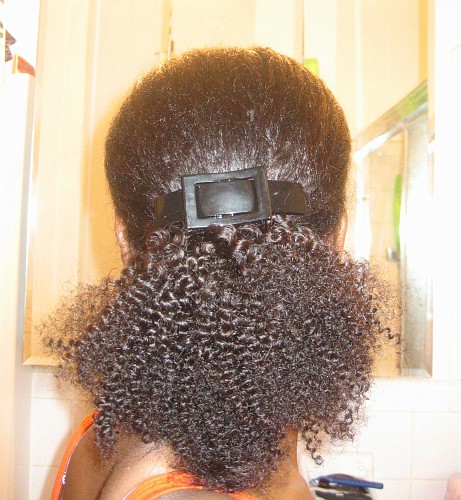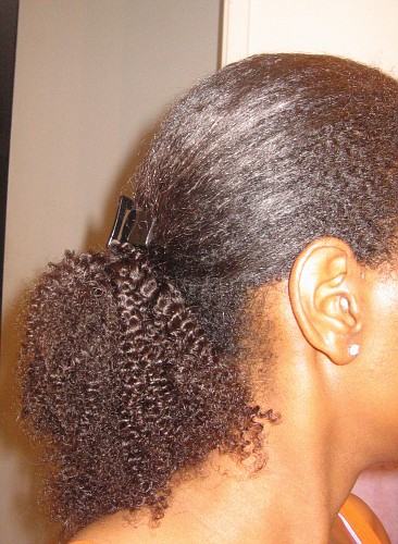 I was looking for a protective hairstyle for natural hair to give myself a break.  I was debating buying the clip on hair piece called “The Mane Clip” and decided to play around with extensions that I had in the house and a hair clip to see if the mane clip is something that I could use.  I made something equivalent and saved a lot of money.  I ended up also buying some human hair extensions, Milky Way, to use for my phony ponytail.