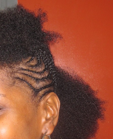 The hair model prior to me, transitioning since March, who was been flipping through a magazine and one of the styles was a woman with bantu knots (knots still installed).  I have never been successful with trying to bantu knot out my hair so I picked a style that incorporated bantu knots.  To make it edgy for the hair show, the style also included side cornrows which gave me a frohawk look.
