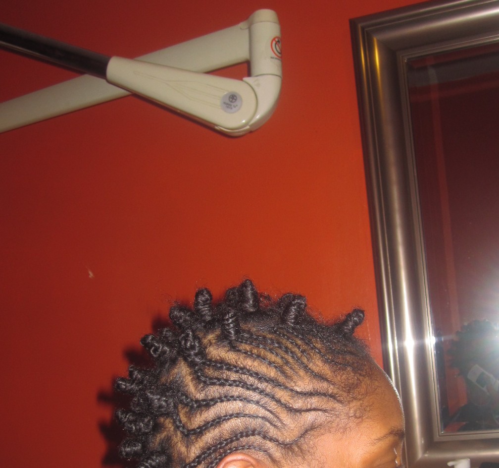 Sabine started to braid my hair and I was immediately worried.  Although I had witnessed her rod setting the hair model prior to me (transitioning with a couple of inches of relaxed ends), I did not see the cornrow part of that style.  I automatically thought they must be tight and painful and that I did not want that done to my hair.  I was texting photos to a friend who thought the same thing, that the braids looked tight, and she said I need to make sure they were not going to be damaging to my hair.  Boy was I wrong! Sabine does not braid tight at all.  In fact, I have braids at the temples of my head (most fragile section of my hair) and they are not tight or painful in the least.  When 1 or 2 braids did feel tight, I told Sabine and she immediately loosened it.