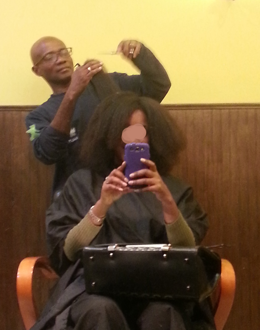 Michael took me right away, no waiting.  I knew right away that it was not going to be an easy experience when the wide tooth comb out started on my dry twisted hair.  It was too rough for my liking and I heard my hair popping.  Mike did listen to me when I told him he was pulling too hard and he was more gentle but I still heard my hair strands popping.  We did a quick shampoo and Michael commented that my hair was clean after only one shampoo.  He did shampoo a second time and then used some product which he said would “soften” the hair.  It smelled nice but I don’t know what it was.  He did a blow out with a comb attachment and it was also a bit too rough for my liking.  He asked if I wanted a flat iron and I said no.  He proceeded to trim my hair, just a little like I asked, and I decided to keep the blown out look for my trip home.  It was cheap – $26 – but I gave him $34.  I think he is great for someone with type 2 waves or type 3 looser curls.  I would not recommend him for type 4 heads i.e., if you natural hair can pass for a straw set then you may want to look elsewhere.
