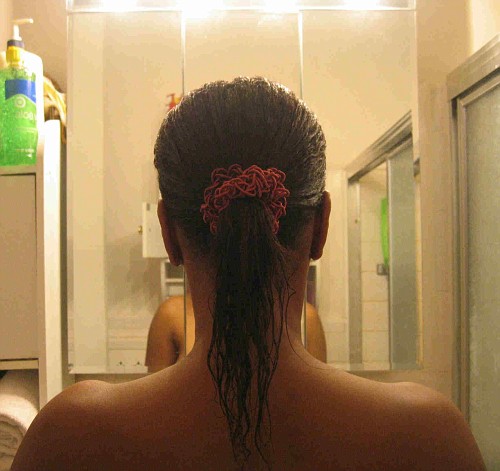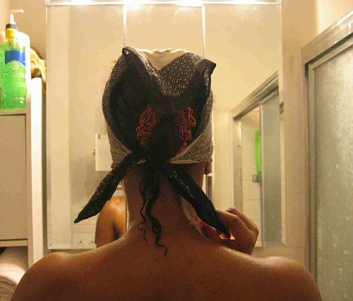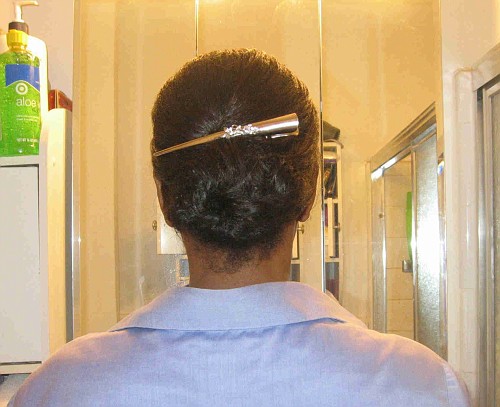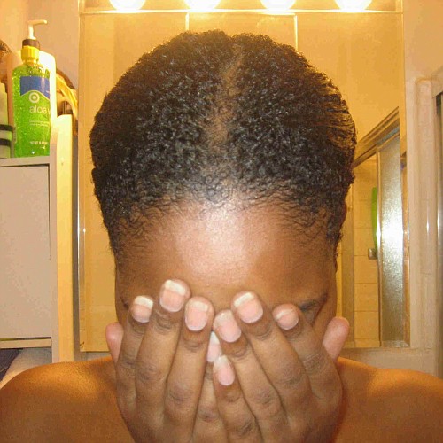 I did a morning cowash and detangled with my denman brush.   I sat under the dryer for a few minutes (running late for work) so as not to leave the house with soaking wet hair.  I rode to work for about 1 hour with a scarf on my head (used aloe vera gel).  Later in the day I pinned up my hair once it had dried some.